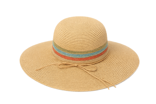 Delicate bands of color encircle the crown, finished with a simple tie detail that lends an effortless, refined touch. Designed to complement warm-weather wardrobes, this hat transitions seamlessly from everyday wear to resort settings.